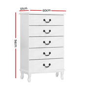 Add a touch of French provincial to your home with our charming KUBI Tallboy chest of drawers. It is not only timeless design – the unit is made to both last and pleases, with 15mm thick MDF boards, beautifully curved pinewood legs, smooth drawer runners, and vintage metal handles. Five large drawers provide plenty of storage for all your daily essentials so that everything is close at hand. The classic design means that this chest of drawers will suit any room, all year round! Better still, you can mix and match with other products from the KUBI series for a complete timeless style.
