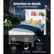 Made of natural pine wood, the Artiss Conqueror Bed Frame is ideal for kids as it for any adult. Strong and sturdy, the bed frame comes with a solid plywood slated base, reinforced supports across the frame, heavy-duty steel fixings and smooth edges all round. Finished in a non-toxic, eco-friendly white paint, the neutral coloured bed frame is also very practical with ample storage from a headboard that comprises three open compartments and a closed shelf that folds down as well as more room beneath the bed frame for optional trundle drawers or any storage boxes. Fact it, this charming bed frame is designed to please in more ways than one.