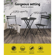 Looking to create a chic and gorgeous outdoor setting? The Gardeon 3-piece outdoor bistro set is a must purchase. It will liven up your outdoor space and help you achieve an elegant outdoor setting where you can enjoy day and night and summer and winter. The set comprises of two chairs and a matching table. Its beautiful and versatile design makes it perfect for indoor and outdoor use. This outdoor bistro set features a heavy-duty, powder-coated galvanised steel frame that is quite sturdy and durable. It has easy slide up/down locking mechanism that ensures stability. The chairs have 150kg weight capacity while the table has 90kg weight capacity, both meticulously designed for robust use. Our outdoor bistro set boasts foldable design that enables you to save space. It doesn't require any assembly, which makes it easy to set up. Furthermore, the chairs flaunt curved back design for comfortable sitting and comes with a scratch-resistant pads and protection cover that prevents tilting or slipping. The outdoor table and chair surface is smooth to touch, and the rust-resistant and water-resistant frame makes it suitable for indoor and outdoor use. Our outdoor bistro set is nothing mundane, but an extraordinary piece. Now create a praise-worthy spot with just a little creativity that will wow your guests using our Gardeon outdoor bistro set.
